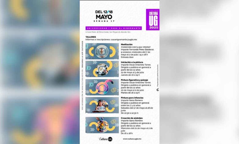 - “Pintura figurativa y paisaje”, impartido por Oscar Antonino Torres y dirigido al público en general a partir de los 12 años: los martes del 20 de mayo al 1 de julio, de 16:00 a 19:00 horas.