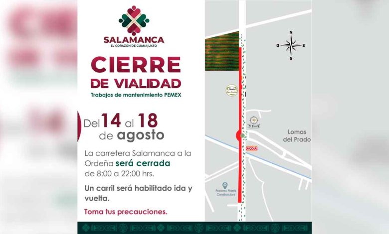 Petróleos Mexicanos informa a la población que por trabajos de mantenimiento a realizarse en un tramo de la carretera Salamanca a la Ordeña, será cerrado en un carril a partir del lunes 14 al viernes 18 de agosto desde las 8 de la mañana hasta las 10 de la noche.