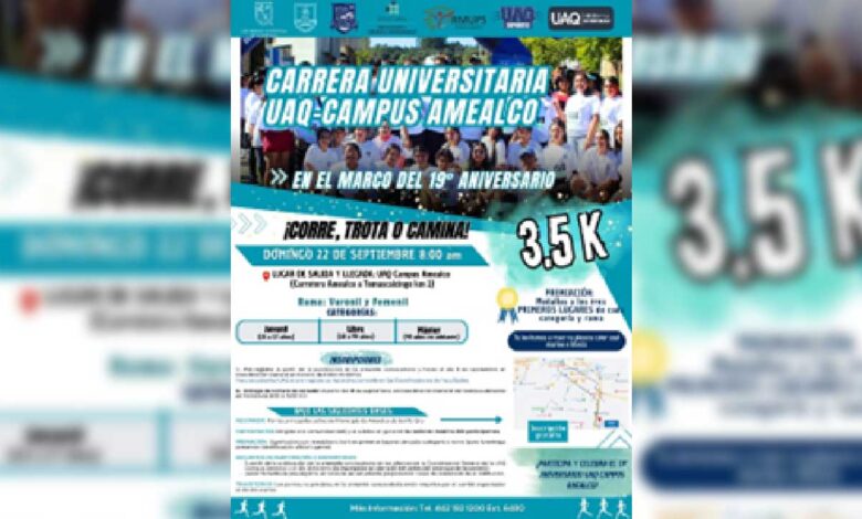 En el marco del 19 Aniversario del campus Amealco de la Universidad Autónoma de Querétaro (UAQ) el próximo domingo 22 de septiembre se realizará la tradicional carrera conmemorativa, abierta a la comunidad universitaria y al público en general.