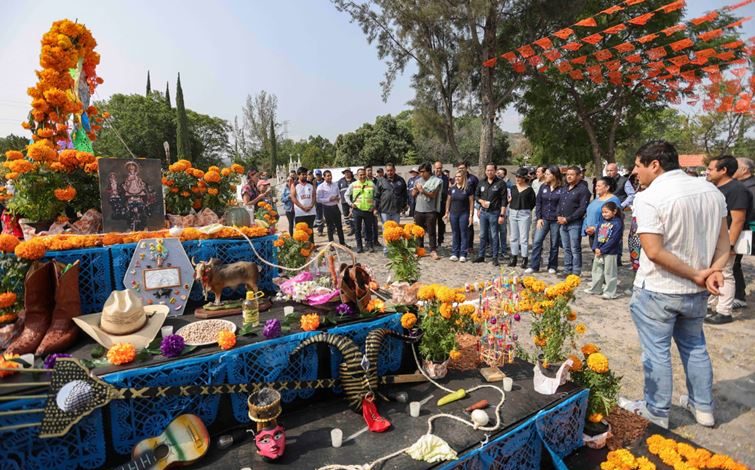 Durante su visita, Chepe Guerrero, acompañado por integrantes del gabinete, así como Regidoras y Regidores, escucharon la historia de los altares monumentales colocados en ambos panteones por parte del personal de Servicios Públicos Municipales, además de hizo entrega de flores de cempasúchil y veladoras a las y los presentes.