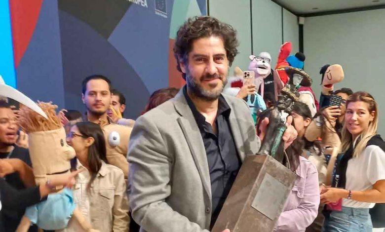 Comenzaron a llegar muchos jóvenes con títeres de guante de personajes que no conocíamos. Nos preguntabamos si habría habido algún taller de manufactura de títeres. En eso se escuchó un grito colectivo y aplausos. Entraba Tute, Juan Matías Loiseau, el caricaturista argentino que ha hecho revuelo con sus tiras cómicas, influenciado -lo dijo él- por Quino y por su padre, también caricaturista. Y las figuras que veíamos que traían algunos, eran los personajes de sus tiras cómicas. Estaban ahí la Directora de la Feria y el Rector de la Universidad de Guadalajara. También el titular de la carrera de Arquitectura y diseño. Este último y la Directora, dieron sendos mensajes que nos informaron sobre Tute. Él se notó conmovido, abrumado, agradecido. Dijo algunas palabras, luego vinieron las fotos con sus seguidores. Se convirtió aquello en un jolgorio. Maru y yo nos trepamos al escenario para tomar fotos más de cerca. Tute posaba para los fotógrafos y nos quedaba de perfil. Le grito: «Tute, por favor, voltea acá para la cámara» y así lo hizo con una sonrisa y su reconocimiento de la Catrina. Transmitimos para Radar del Centro, como no. Ahí está consignado.
