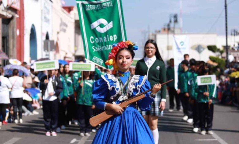 Familias salmantinas se aglomeraron sobre la calle Zaragoza para ser testigos de este gran desfile, en el que marcharon, hacia la plaza cívica Miguel Hidalgo, servidores públicos de la administración municipal, Seguridad Pública, Movilidad, Protección Civil, el Heroico Cuerpo de Bomberos, Cruz Roja delegación Salamanca; así como la comunidad estudiantil de diferentes instituciones educativas, grupos de diversas disciplinas deportivas, el ballet folclórico Xidoo y el grupo de cabalgadores.