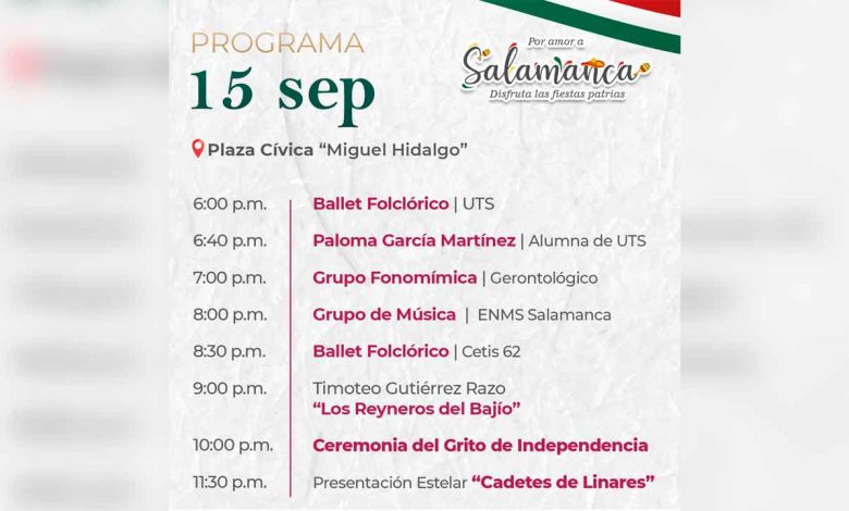 De acuerdo a lo dado a conocer por la Presidencia Municipal de Salamanca, la tradicional ceremonia de El Grito se efectuará a las 10 de la noche.