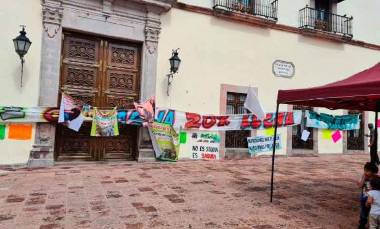 Estos grupos han llenado de mantas y carteles el Palacio de la Corregidora, “Agua para la gente, no para las empresas” dice una de estas; “No más represión, el agua es de la Nación” o bien, “Maconí en busca de agua; nuestros pies duelen, pero nuestros corazones arden” dicen, entre unos 15 carteles y mantas.