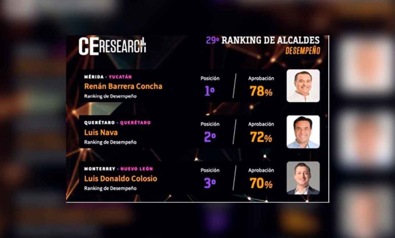 Primer lugar y con 78 puntos de aprobación, está el alcalde Renán Barrera Concha, alcalde de la ciudad de Mérida. En segundo lugar, se ubica el alcalde de Querétaro, Luis Nava, con 72 por ciento de aceptación general. En tercer puesto, ubican a Luis Donaldo Colosio, alcalde de Monterrey; en cuarto lugar, está Eduardo Rivera, alcalde de Puebla y en quinto, el alcalde de Guadalajara, Pablo Lemus Navarro. Y claro siguen otros muchos, si bien solo estoy poniendo a los punteros.