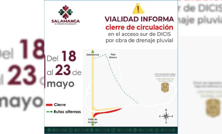 Por obras de rehabilitación del drenaje pluvial, CMAPAS ha dado el aviso, oportunamente, del cierre del acceso a DICIS (División de Ingenierías Campus Irapuato-Salamanca), por lo que permanecerá cerrado a la altura del lado sur de la Avenida Valle de Santiago a Salamanca.