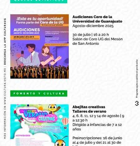 Guanajuato, Gto., a 19 de julio de 2025.- La Universidad de Guanajuato (UG) invita a disfrutar del verano con una variada oferta cultural que, del 21 al 27 de julio, ofrecerá actividades para públicos de todas las edades, con especial atención a las infancias, las artes visuales, la música, el cine y la divulgación del conocimiento.